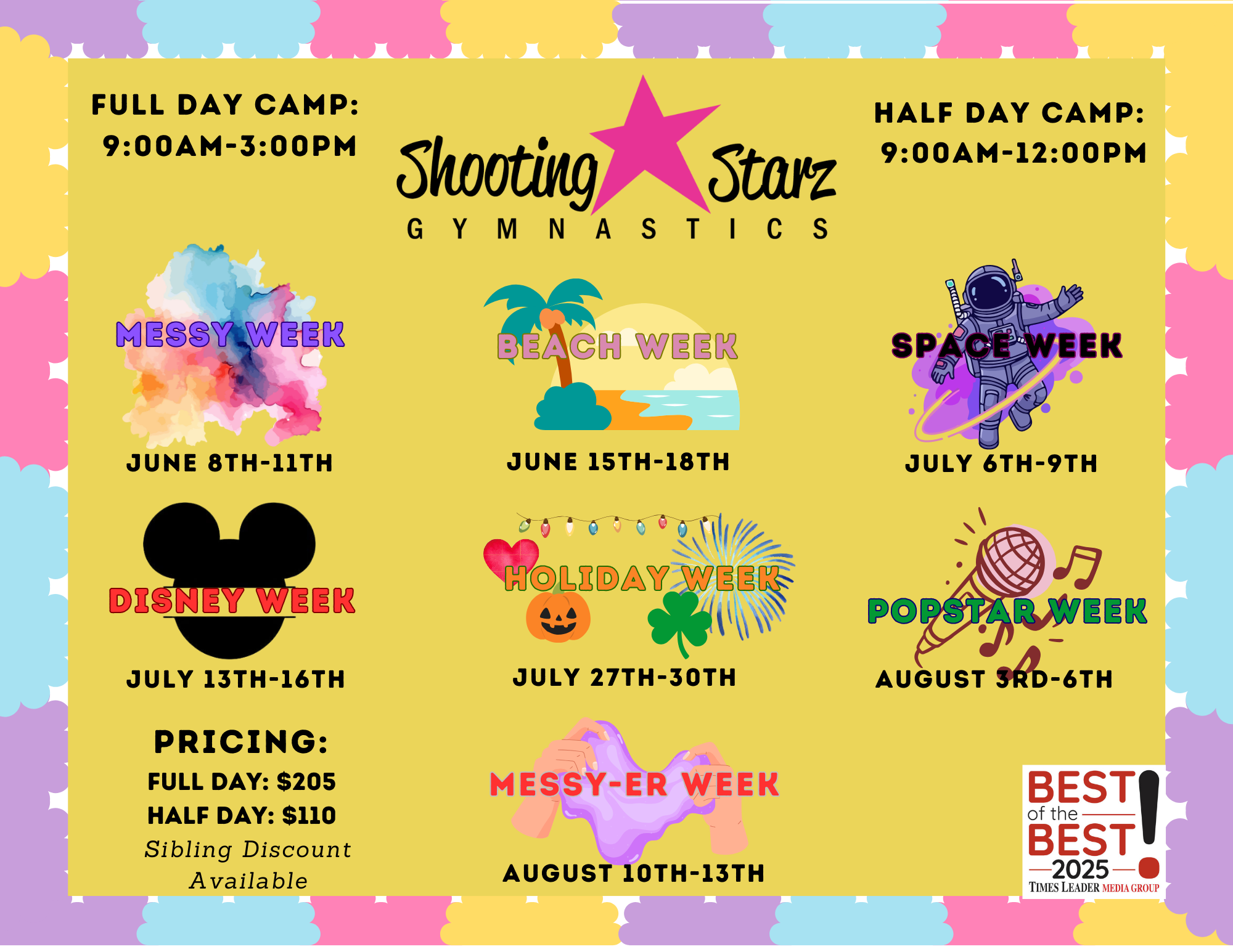 Camps at Shooting Starz aren’t just about gymnastics! Each week has a theme with arts-and-crafts, games, gymnastics, and more fun activities. Head to the parent portal to sign up!