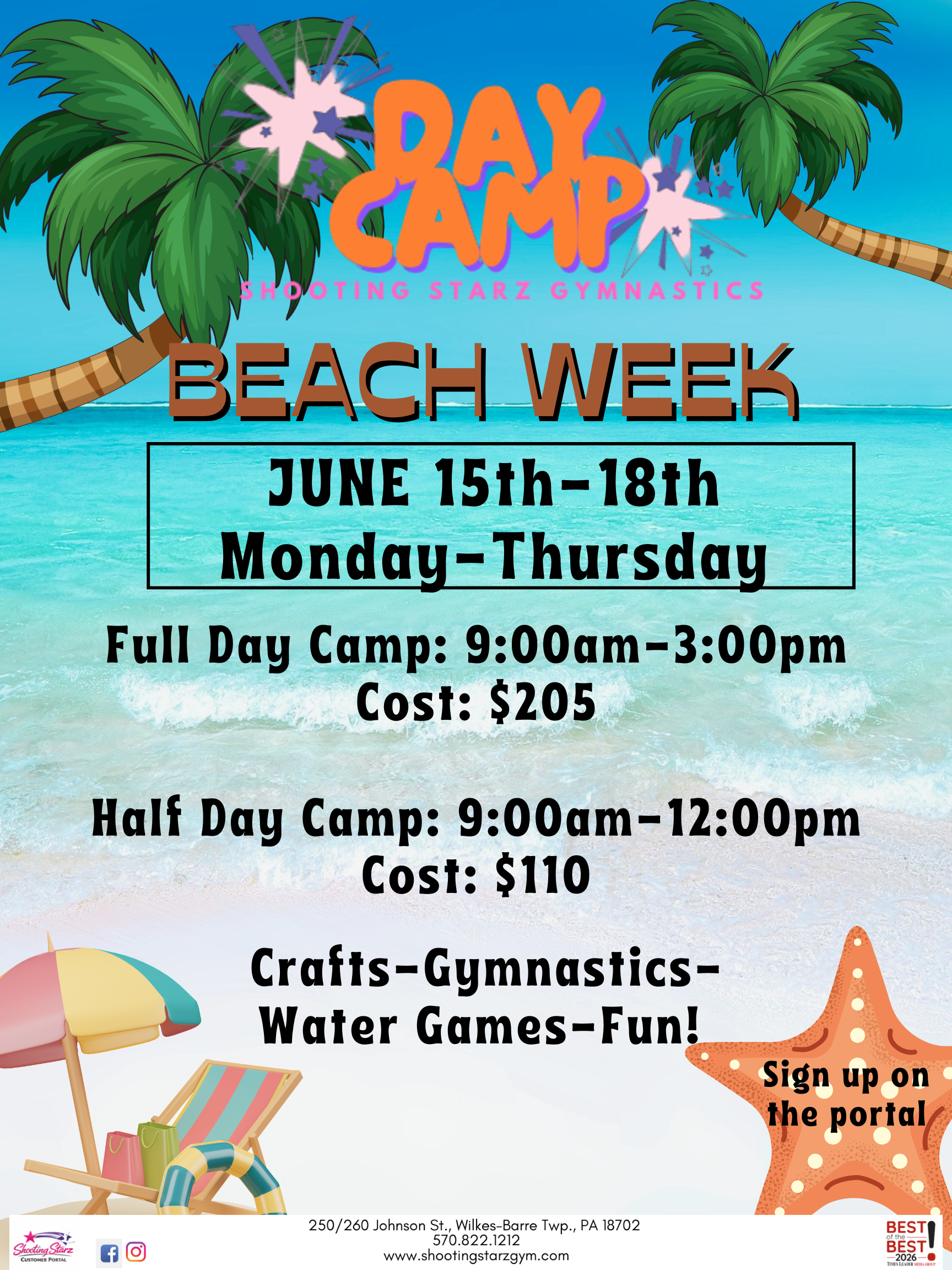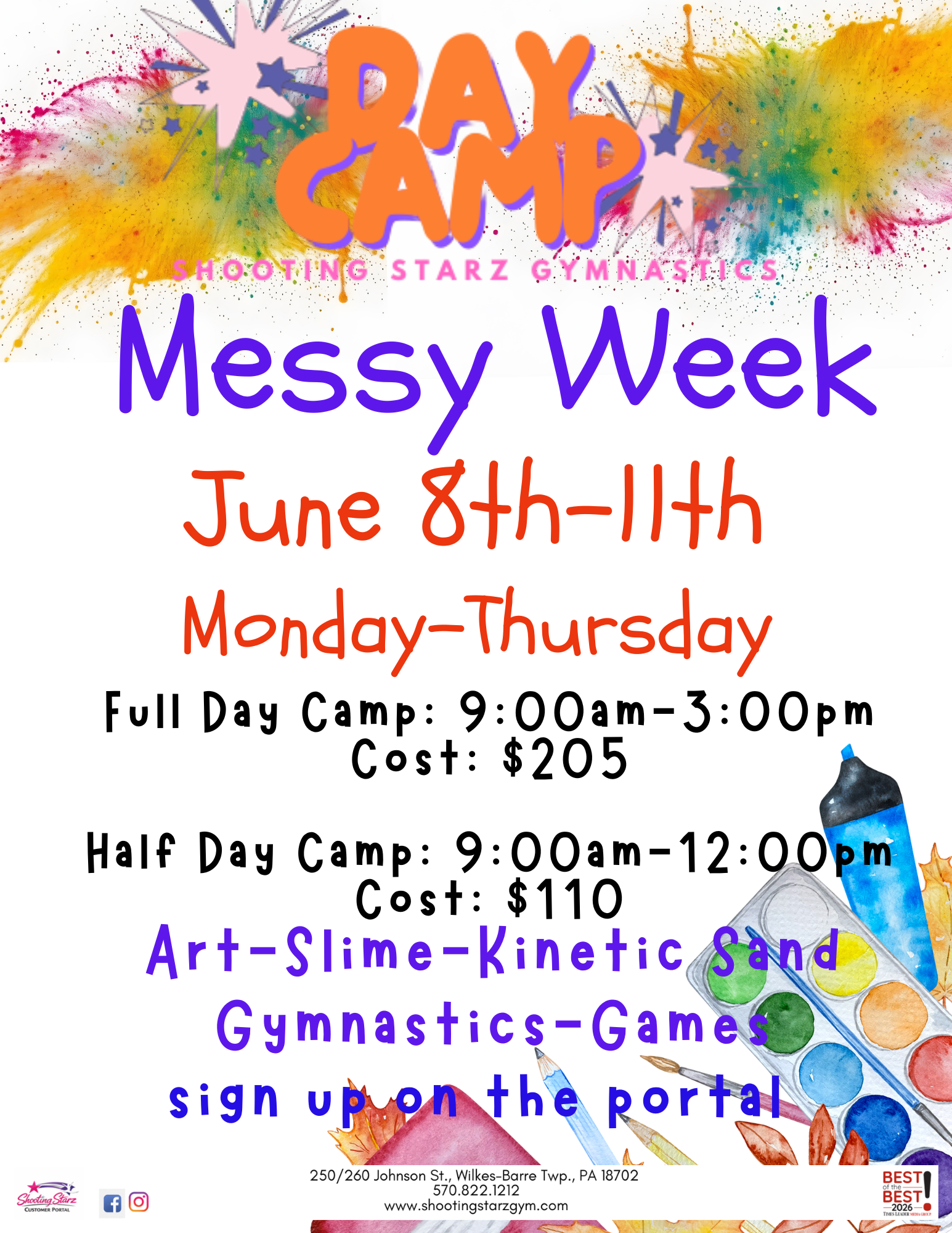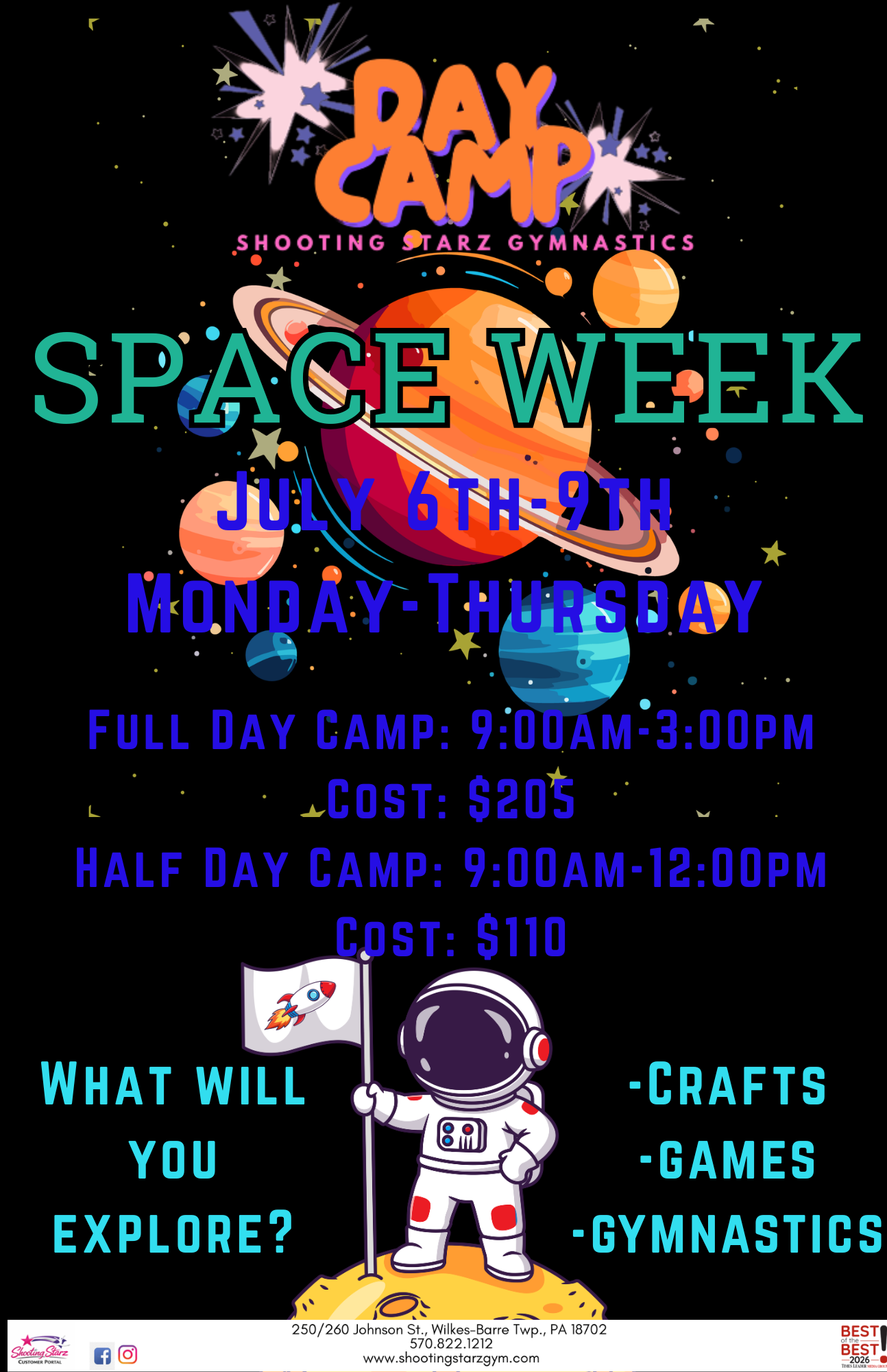 Camps at Shooting Starz aren’t just about gymnastics! Each week has a theme with arts-and-crafts, games, gymnastics, and more fun activities. Head to the parent portal to sign up!
